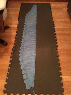 Nu ligger den blockad och har förhoppningsvis torkat ordentligt tills imorrn. Efter blötläggningen trampade jag ur den i en handduk (som jag alltid gör) men den blev lite för torr (?!) så jag fick spreja den med vattenflaskan efter blockningen. Ser ut att bli riktigt fin. :)